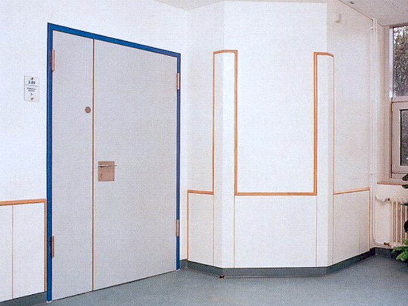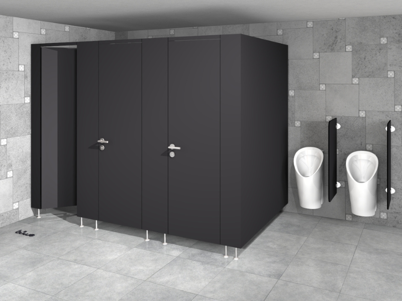 Cloisons en panneaux massifs de résine synthétique 12 mm (HPL), 100% étanches à l'eau. Raccord mural, battue de porte, angle arrondi, rail et renfort supérieur en aluminium éloxé incolore. Possibilité d'obtenir des profilés de couleurs thermolaqués par poudrage sur demande.