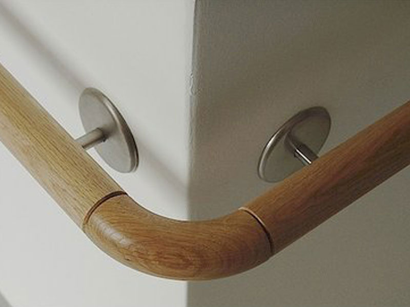 Der Handlauf weist einen Durchmesser von 40 mm auf, was ein sehr sicheres und angenehmes Greifen erlaubt. Die Holzart und Farbe des Handlaufs kann identisch der Zierleiste des Wandschutzes gewählt werden. Bei den Sicherheitskonsolen kann zwischen Edelstahl natur oder farbig pulverbeschichtetem Stahl gewählt werden. Die Befestigung erfolgt, je nach Wahl, über eine sichtbare oder verdeckte Verschraubung. Individuell angepasste Längen und saubere Lösungen für Ecken und Abschlüsse versprechen ein Höchstmass an Sicherheit.