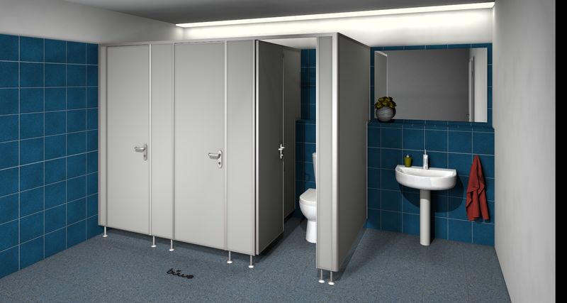 Trennwände in modernem Design. Hergestellt aus 26 mm dicken Vollspanplatten mit beidseitigem Kunstharzbelag von 0.8 mm Stärke. Optimaler Kantenschutz durch Einfassung aller Plattenteile mit Aluminiumprofilen. Konstruktionsteile wie Wandanschlüsse, Kopfschienen, Türanschläge und Stützfüsse aus Aluminium. Montageteile sind standardmässig farblos eloxiert.