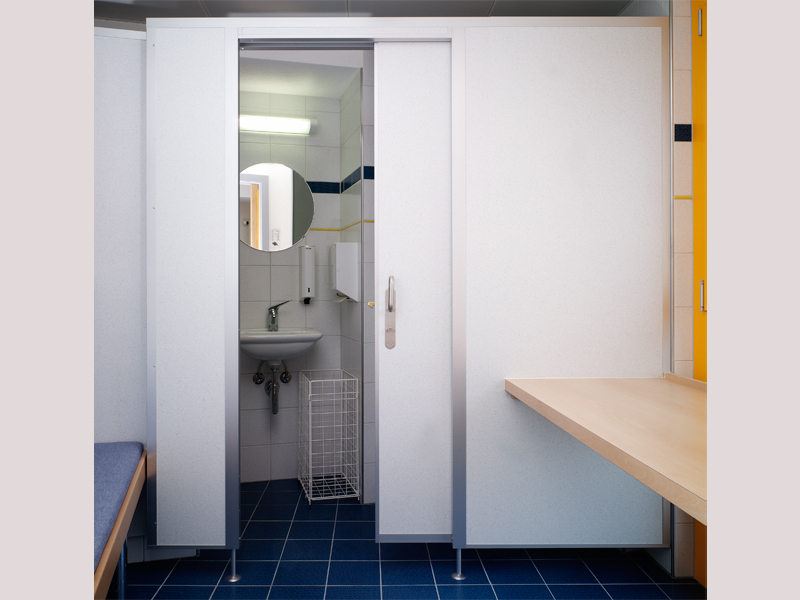 Trennwände aus 30 mm starken, kunstharzbelegten Vollspanplatten in modernem Design. Optimaler Kantenschutz durch Einfassung aller Plattenteile mit Aluminiumprofilen. Konstruktionsteile, wie Wandanschlüsse, Kopfschienen, Türanschläge und Stützfüsse aus Aluminium. Montageplatten und Abdeckrosetten aus rostfreiem Stahl. Die Aluminiumteile sind standardmässig farblos eloxiert, können auf Wunsch aber auch farbig pulverbeschichtet werden.